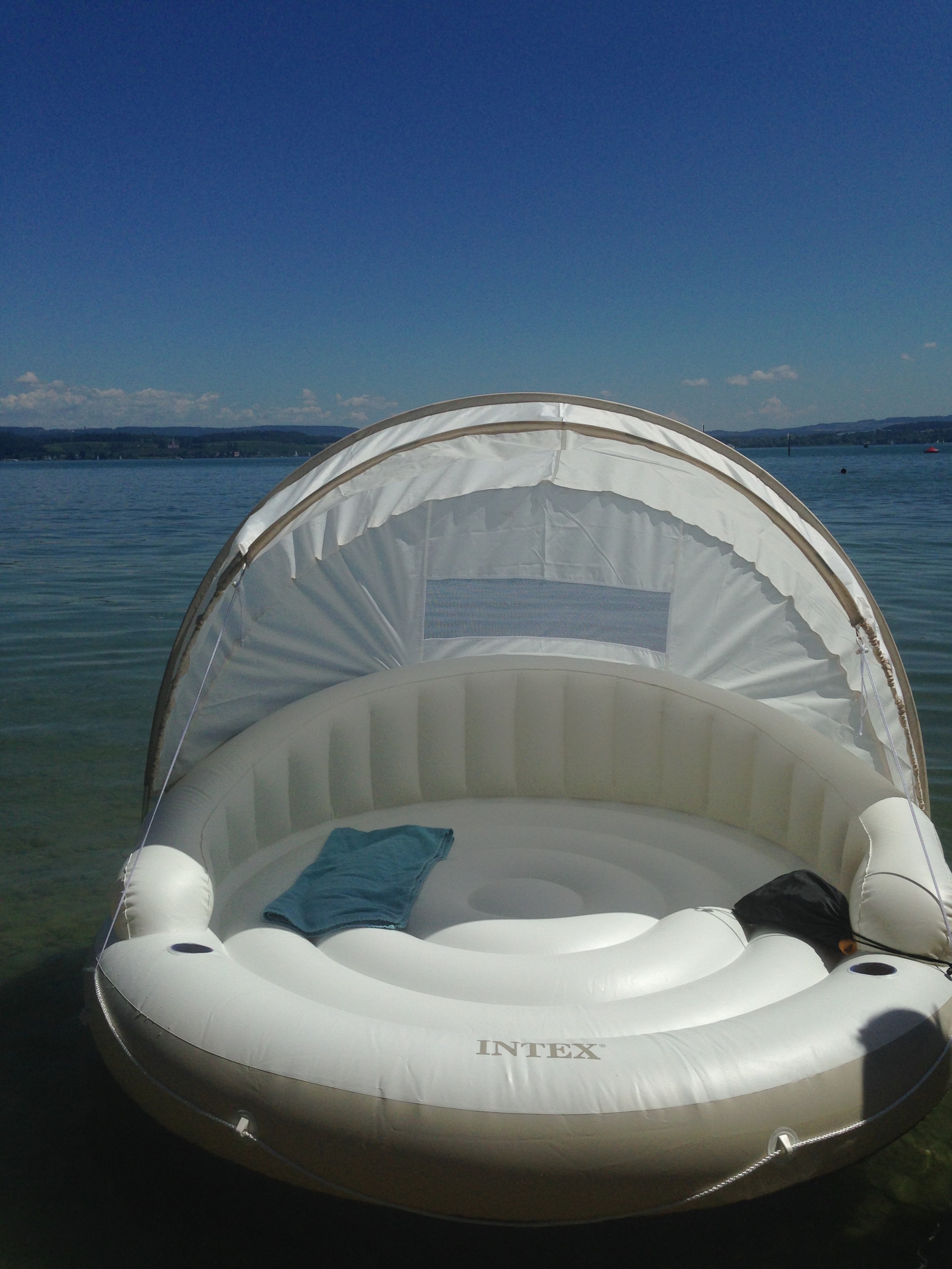 Als sie wieder zurück war, hat sie eine aufblasbare Badeinsel bekommen und diese auch gleich im Bodensee genutzt.